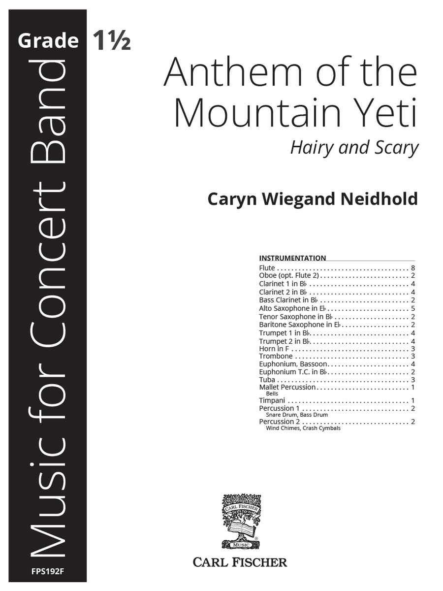 Of course the mountain yeti should have an anthem—a call to the wild forest, icy streams, and towering cliffs. The signature yeti call in the trombone and horn sections fires the imagination and carries on the mystery of the mountain yeti.Most quarter and eighth notes should tend toward staccato rather than legato. At m. 21, the half notes should be played as legato as possible with the contrasting shorter eighth notes in the accompaniment. Also, at m. 21, the bell part has a repeating six-note pattern, allowing students to memorize this pattern.In the trombone and horn glissandi (m. 8), the crescendo only goes to a forte dynamic and should not overpower the rest of the band. Additionally, the glissandi should be in rhythm with a half note at the top and not held over. When pitches are indicated with X noteheads, students may start from a random low note and glissando to a random high note. It should sound atonal and a little chaotic, just like a yeti.