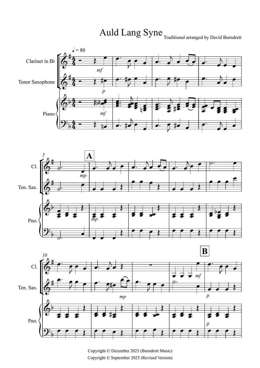 Composed by Traditional. Arranged by David Burndrett. This edition: audio, pdf. Traditional. 7 pages. David Burndrett #1280100. Published by David Burndrett (A0.1716635).This is my arrangement of the popular piece Auld Lang Syne.