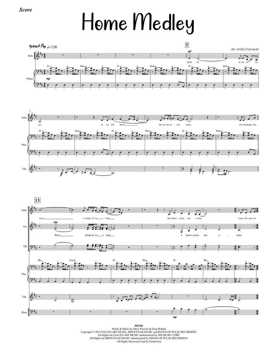 By Meat Loaf and Phillip Phillips. By Jim Steinman. Arranged by Anita Cracauer. This edition: pdf. Pop, Rock, Show Choir. 51 pages. ShowChoirStock.com #1280095. Published by ShowChoirStock.com (A0.1716630).This is the full score and all instrumental parts for the choral arrangement of "Home Medley" (Home/In The Land Of The Pigs). The instrumentation is for piano, violin, synth, guitar, banjo, bass, drum set, percussion, trumpet, horn, 2 trombones, alto sax, tenor sax, & bari sax.