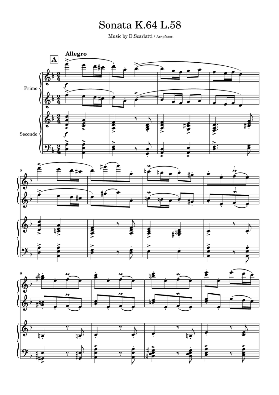 Composer: D.Scarlatti Song: Sonata K.64 Orchestration: Piano 4hands Key:Dm (original key) Level: Intermediate (level varies by individual).