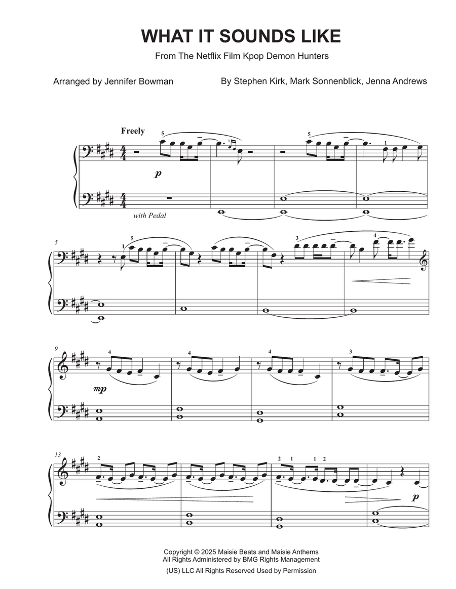 By Huntr/x. Composed by Jenna Andrews; Mark Sonnenblick; Stephen Kirk. Arranged by Jennifer Bowman. This edition: audio, pdf, streaming. Broadway, Contemporary, Film/TV, Musical/Show, Pop, Rock. Score. 6 pages. Jennifer Bowman #1280112. Published by Jennifer Bowman (A0.1716647).