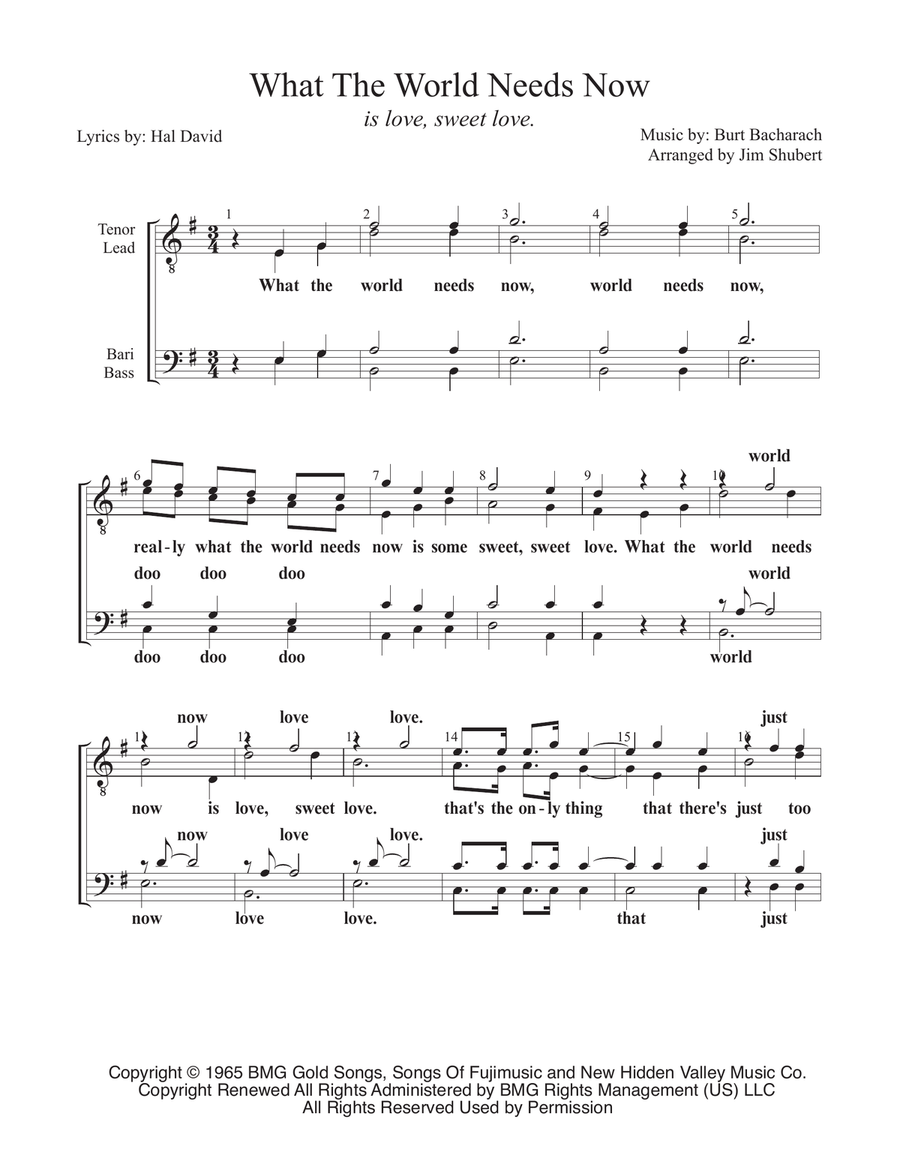 By Jackie DeShannon. Composed by Burt Bacharach and Hal David. Arranged by Jim Shubert. This edition: audio, pdf. 20th Century, A Cappella, Barbershop, R & B. 3 pages. James W. Shubert #1280111. Published by James W. Shubert (A0.1716646).
